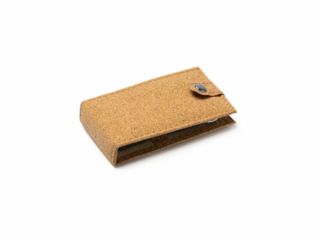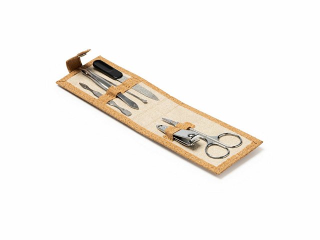 Маникюрный набор в чехле из пробки с застежкой на кнопу. Включает ножницы, пинцет, кусачки для ногтей, пилку и средство для удаления кутикулы из нержавеющей стали. |