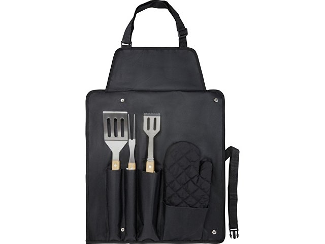 Набор для барбекю из 5 предметов: лопатка (36,5 x 7 см), вилка (36,5 x 2 см), щипцы (36,5 x 5 см), перчатка (25 x 16 см) и фартук с сумкой (42 x 60 см). Ручки сделаны из бамбука, который добывается и производится в соответствии со стандартами устойчивого развития. |