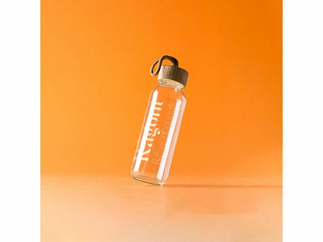 Стеклянная бутылка 450 мл с бамбуковой крышкой и ремешком для переноски с натуральной отделкой. Поставляется в дизайнерской коробке. |