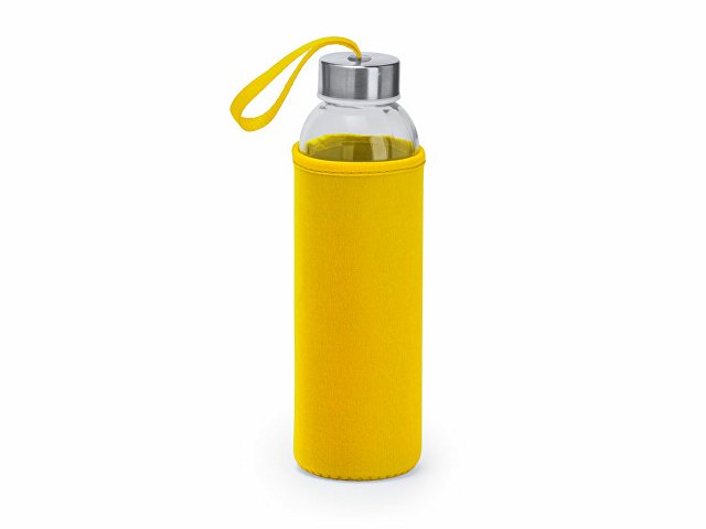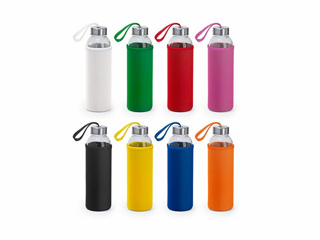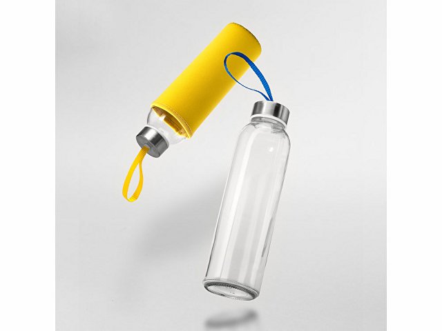 Стеклянная бутылка емкостью 500 мл, чехол из неопрена в сочетании с цветным ремешком для переноски. |