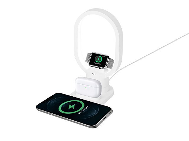 Настольная зарядная станция с лампой для трёх устройств - смартфона с поддержкой беспроводной зарядки, часов Apple и наушников Apple (разъем Lightning). Регулируемый уровень яркости (диммер). Лампу можно вращать вокруг своей оси. Для удобства транспортировки лампу можно отсоединить.