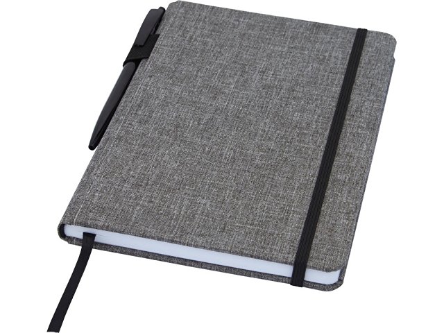 Блокнот формата А5 с отделкой из переработанного ПЭТ. Содержит 96 листов в линию плотностью 70 г/м?, изготовленных из переработанной бумаги, с петлей для ручки и лентой-закладкой. В упаковке из картона. |