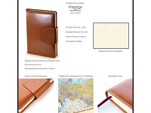 В ежедневнике Prestige есть полезная справочная информация на русском языке, а также страницы для записи идей, мыслей и составления рабочих планов. Дни недели указаны сокращенно на английском языке. Для изготовления страниц используется качественный бежевый офсет повышенной плотности (70 г/кв м), который производится в Японии и подходит для всех видов чернил. Разметка блока с указанием времени позволяет планировать дела с точностью до 1 часа.