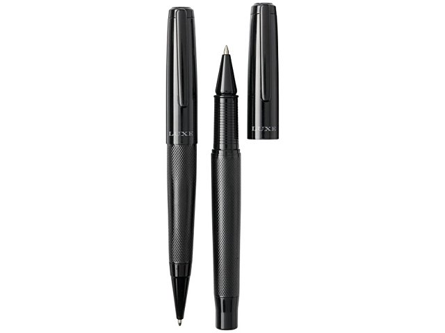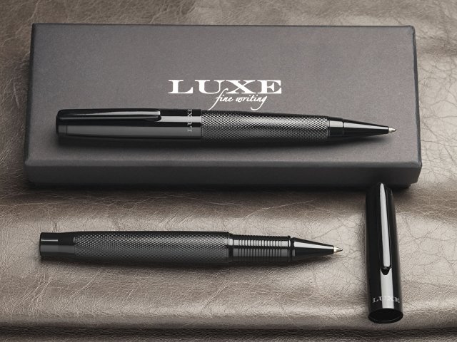 Подарочный набор из двух ручек Gloss. Подарочный набор из шариковой ручки и ручки-роллера с черним колпачком и глянцевым корпусом в подарочной коробке LUXE. Шариковая ручка: 14 см х 1,45 см, вес: 40 г, длина непрерывной линии: 800 м. Ручка-роллер: 13,8 см х 1,45 см, вес: 54 г, длина непрерывной линии: 400 м. Металл. |