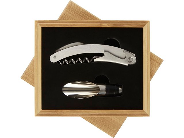 Набор для вина из 2 предметов: штопор официантки и насадка на бутылку. Поставляется в бамбуковой подарочной коробке, изготовленной в соответствии с экологическими стандартами. |