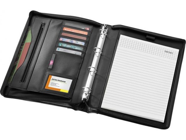 Папка с ручкой, застежкой-молнией, регистратором, карманом на молнии и отделениями для документов. Включает блокнот А4 с 20 страницами линованной бумаги. Ручка и принадлежности не включены. |