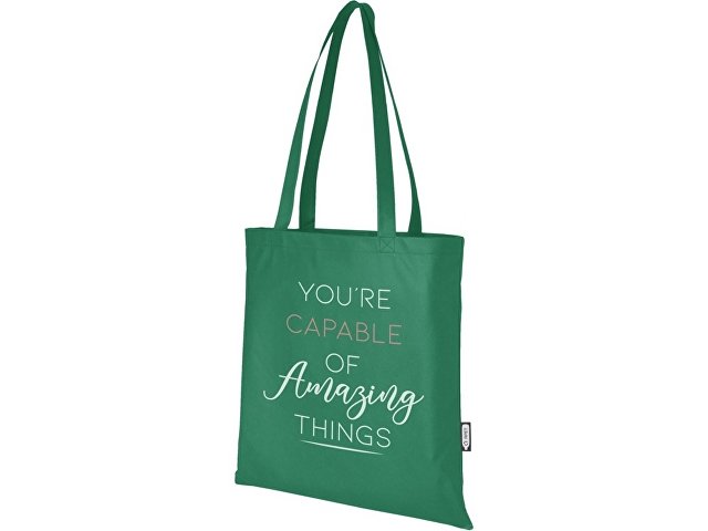 Большая эко-сумка Zeus из переработанных материалов, сертифицированных GRS, изготовленная из прочного и устойчивого к разрыву переработанного PET-пластика, является идеальным и более экологичным вариантом для ярмарок или конференций. Тонкий дизайн делает эту модель элегантной и подходящей для ношения легких предметов, например, блокнота и ручки. Ручки имеют длину 29 см, поэтому эко-сумку легко носить через плечо. Прочность до 5 кг. GRS certified recycled polyester, 80 g/m2. |