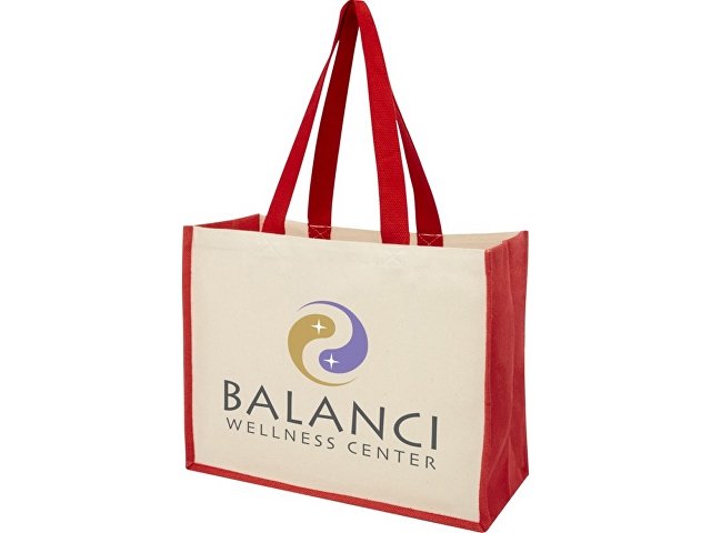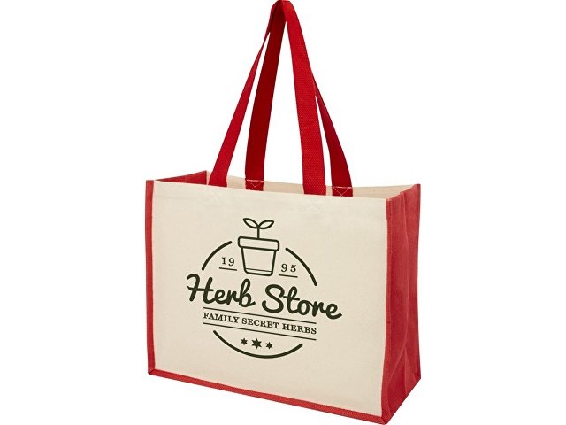 Модная сумка для покупок с боковыми панелями (вес 320 г/м?), подходящими для нанесения изображений, окантовкой из ламинированного джута и хлопковыми ручками. |