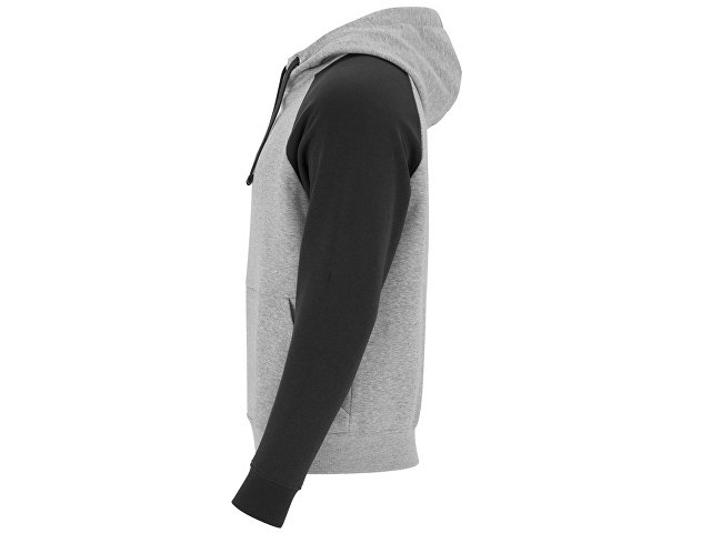 Худи с контрастным рукавом реглан. Капюшон с запахом, с контрастной подкладкой и шнурком. На полочке карман кенгуру. Манжеты рукавов и низ изделия из риба 1х1.