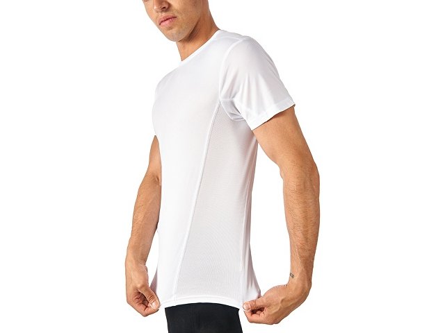 Мужская спортивная футболка выполнена из двух разных видов полотна: спинка и перед из интерлока имеют гладкую поверхность, а декоративные вставки выполнены из спортивной сетки ячеистой структуры. Благодаря наличию таких вставок воздух свободно проникает под футболку, охлаждая кожу во время спортивных нагрузок.