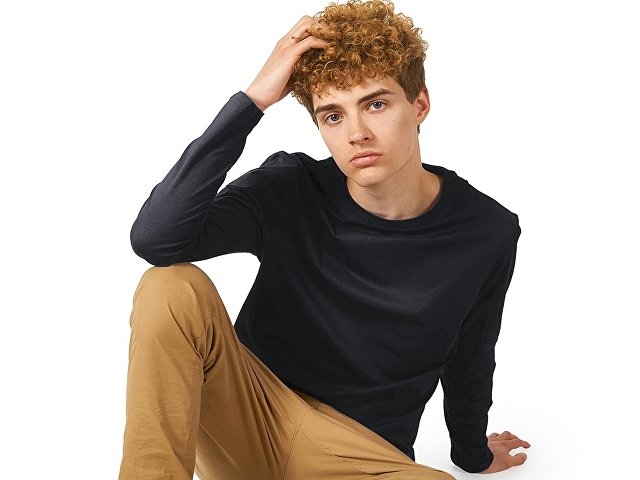 Футболка с длинным рукавом комфортной посадки с боковыми швами. Горловина обработана рибом 1х1 и тесьмой по спинке. Футболка выполнена из хлопкового джерси. |