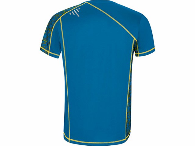 Спортивная футболка с коротким рукавом и принтованными вставками. Контрастные отстрочки плоским швом, светоотражающие элементы на полочке и спинке. Эко лейбл на рукаве.