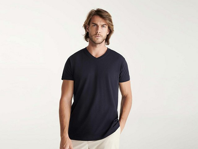 Мужская футболка без боковых швов с коротким рукавом и V-образным вырезом горловины, отделанном рибом 1х1. Горловина и плечевые швы дополнительно укреплены тесьмой. |