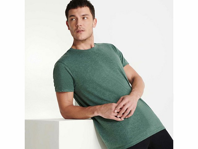 Футболка без боковых швов с коротким рукавом в меланжевом эффекте. Риб горловины 1х1 дополнительно укреплен двойной строчкой. |