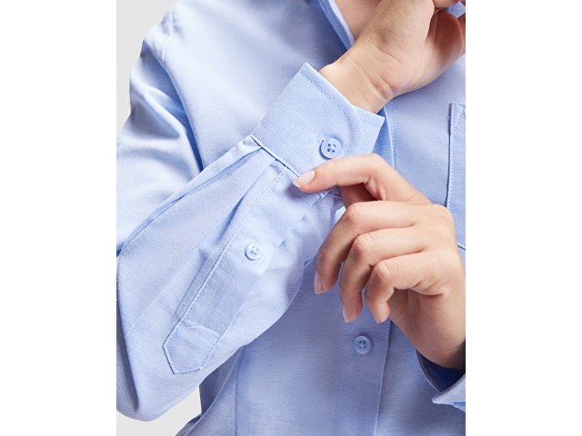 Женская рубашка с длинным рукавом, накладной карман слева. Планка на пуговицах. Отложной воротник на стойке, могут встречаться изделия, где воротник продублирован пуговицами. Манжета регулируется по ширине с помощью 2-х пуговиц. Кокетка на спинке. |