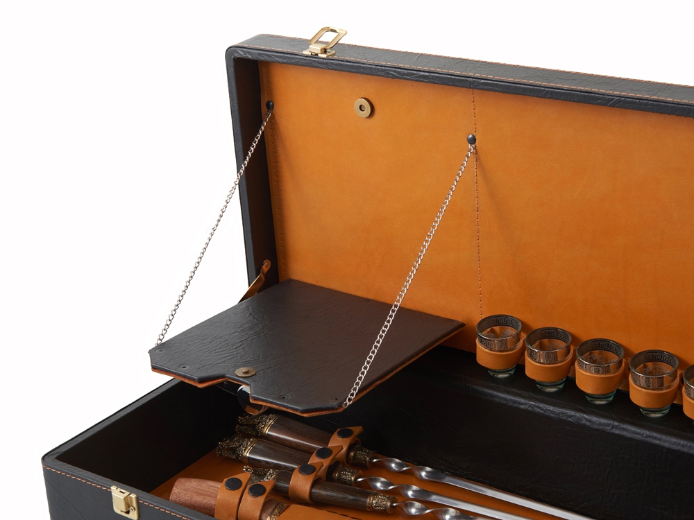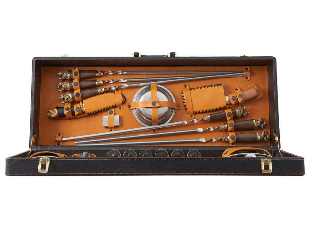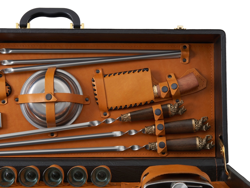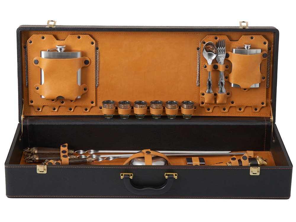 Описание: Кейс из сплит-кожи, с повышенной износостойкостью, внутренняя отделка натуральная кожа. Все аксессуары надежно крепятся к кейсу кожаными ремешками на кнопке, обеспечивая удобство транспортировки и сохранность содержимого. В комплект входит: - шампура большие- 6 шт - фляга 500 мл - фляга 250 мл - тарелка- 6 шт - вилка- 6 шт - ложка- 6 шт - стопка 25 мл- 6 шт - нож Тяпка - нож разделочный - зажигалка