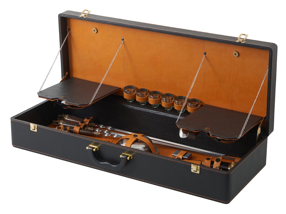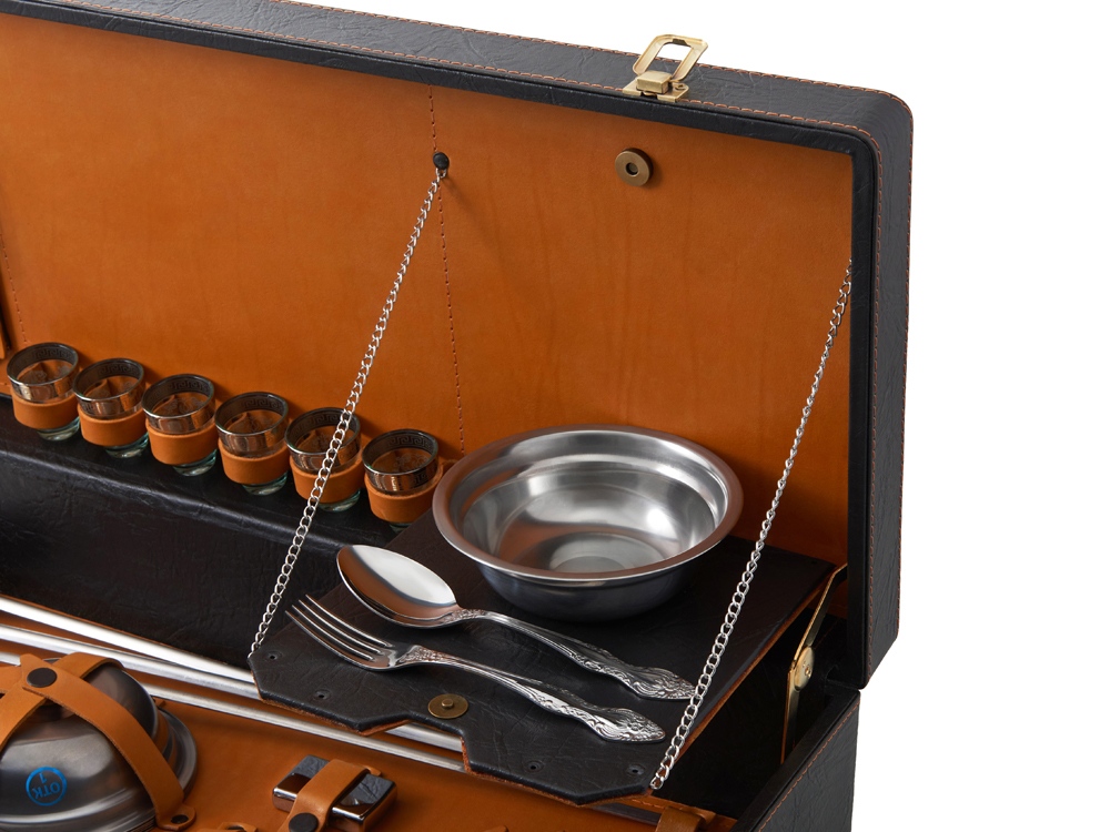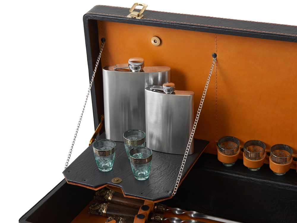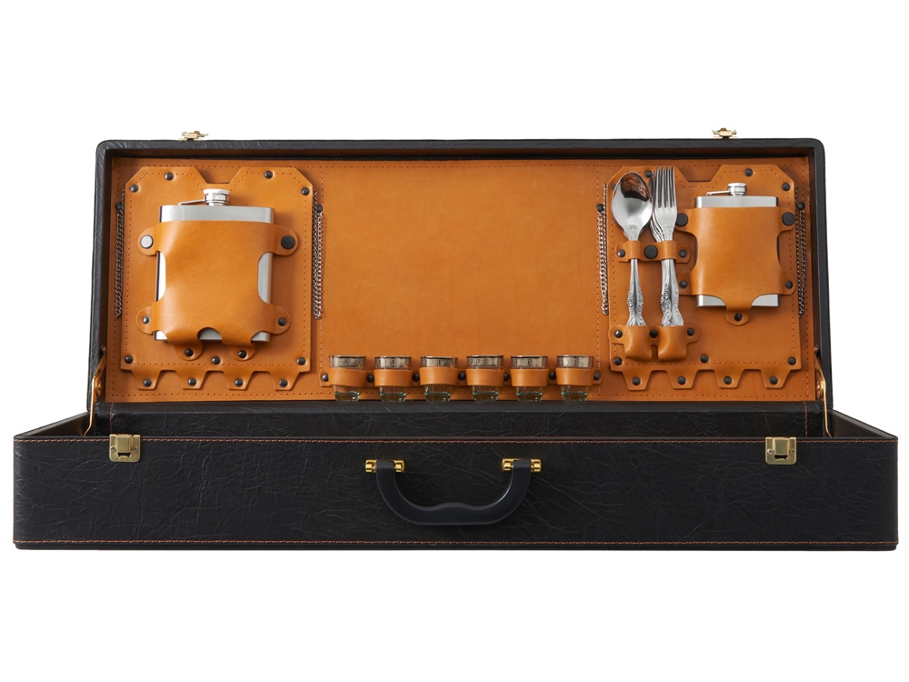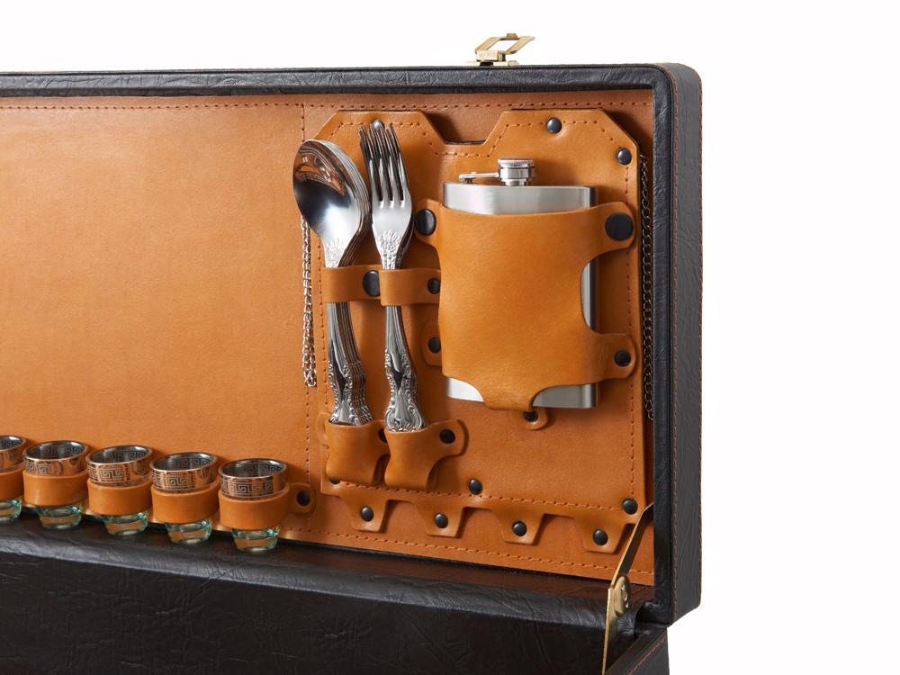 Описание: Кейс из сплит-кожи, с повышенной износостойкостью, внутренняя отделка натуральная кожа. Все аксессуары надежно крепятся к кейсу кожаными ремешками на кнопке, обеспечивая удобство транспортировки и сохранность содержимого. В комплект входит: - шампура большие- 6 шт - фляга 500 мл - фляга 250 мл - тарелка- 6 шт - вилка- 6 шт - ложка- 6 шт - стопка 25 мл- 6 шт - нож Тяпка - нож разделочный - зажигалка