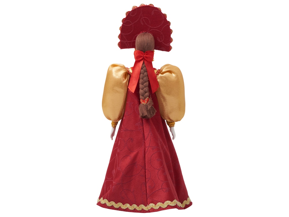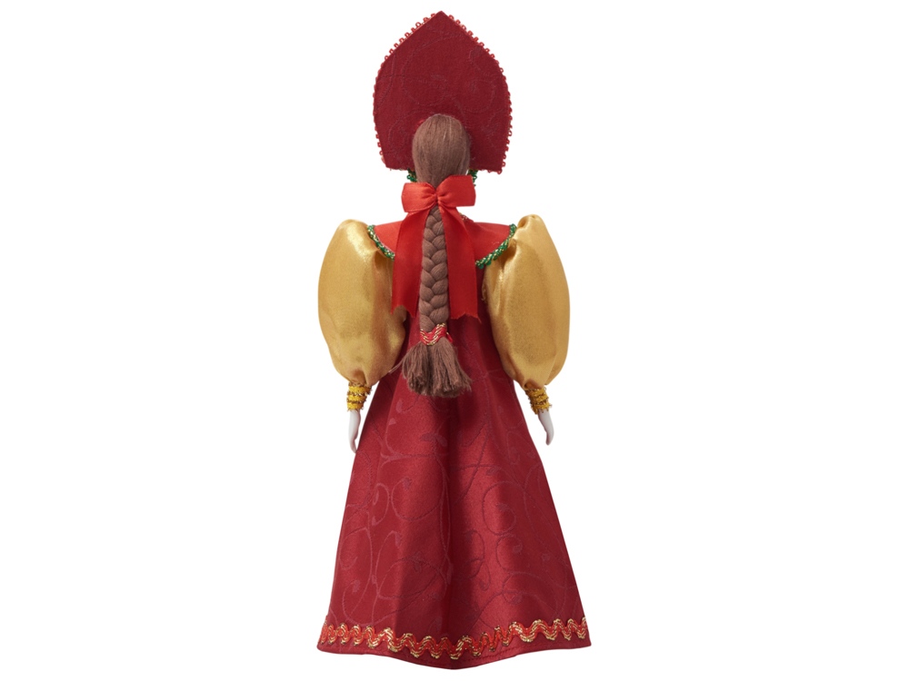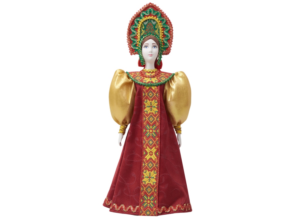 - Фарфоровая кукла в народном костюме ручной работы: алый сарафан с пышными рукавами и расшитый кокошник создают образ русской красавицы в праздничном наряде.