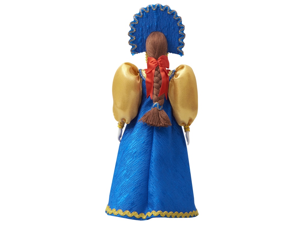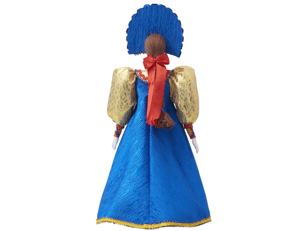 - Куклу ручной работы: сувенирная фарфоровая кукла в традиционном девичьем праздничном костюме. Яркий сарафан синего цвета, пышные рукава и кокошник с богатым декором отражают подлинный облик русского народного наряда.
