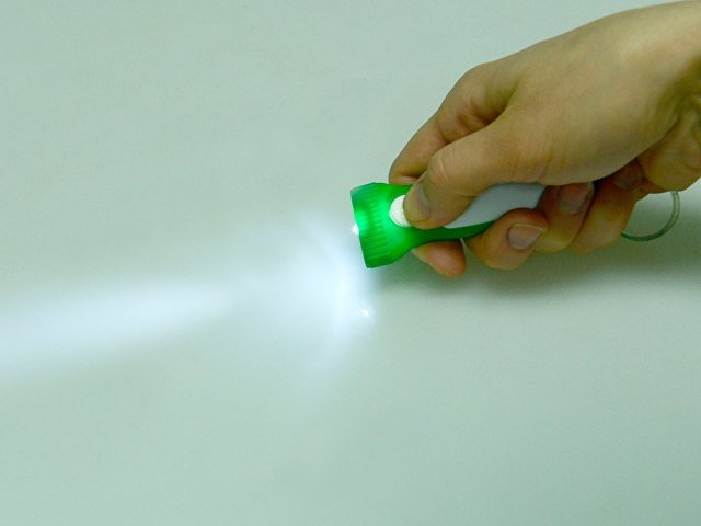 Яркий брелок со встроенным фонариком. Плоская форма и большая ручка с белой вставкой делает брелок удобным для нанесения логотипа. |