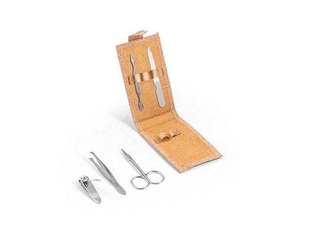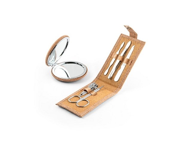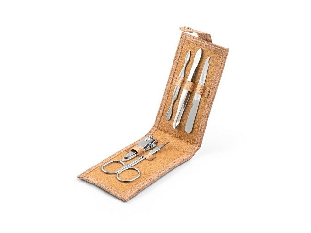 Набор для маникюра из пробки с 5 приборами из нержавеющей стали: пилкой, ножницами, кусачками для ногтей, пинцетом и толкателем для кутикулы. Поставляется в упаковке из натуральной бумаги. 104 x 61 x 17 мм |