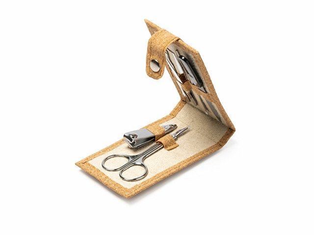 Маникюрный набор в чехле из пробки с застежкой на кнопу. Включает ножницы, пинцет, кусачки для ногтей, пилку и средство для удаления кутикулы из нержавеющей стали. |