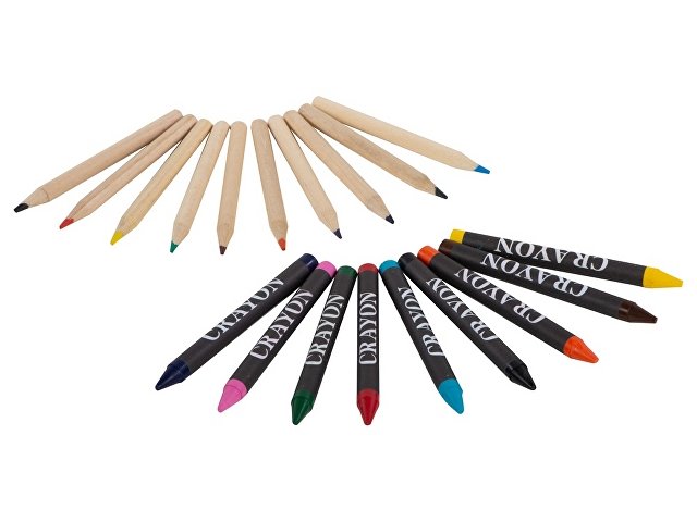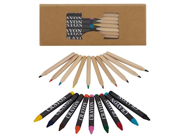 Набор из 19 карандашей. 9 цветных восковых карандашей и 10 цветных карандашей в картонной коробке с пластиковым окошком. |