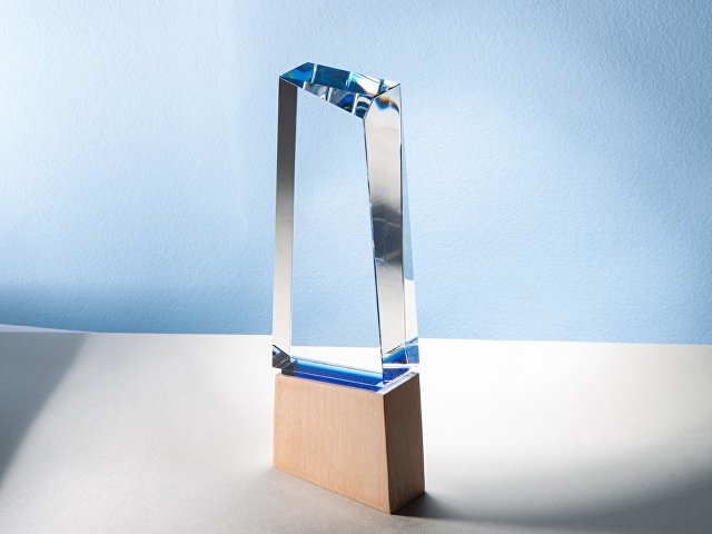 Награда выполнена из стекла, имеет необычную форму и расположена на деревянном постаменте. Лаконична и минималистична.