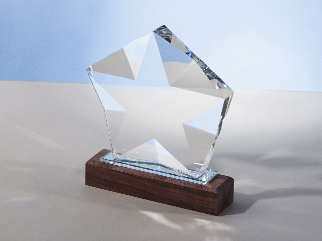 Награда выполнена из прозрачного стекла в виде звезды и расположена на деревянном постаменте. Благодаря выпуклым сторонам она интересно переливается в лучах света.