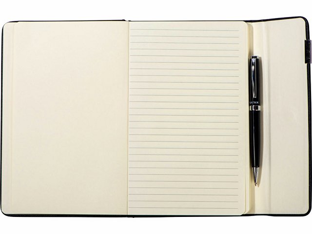 Эксклюзивный блокнот формата A5 с обложкой из термополиуретана, черной лентой-закладкой, застежкой на магните и 80 линованными листами (80 г/м?) кремового цвета. Предлагается с шариковой ручкой. |