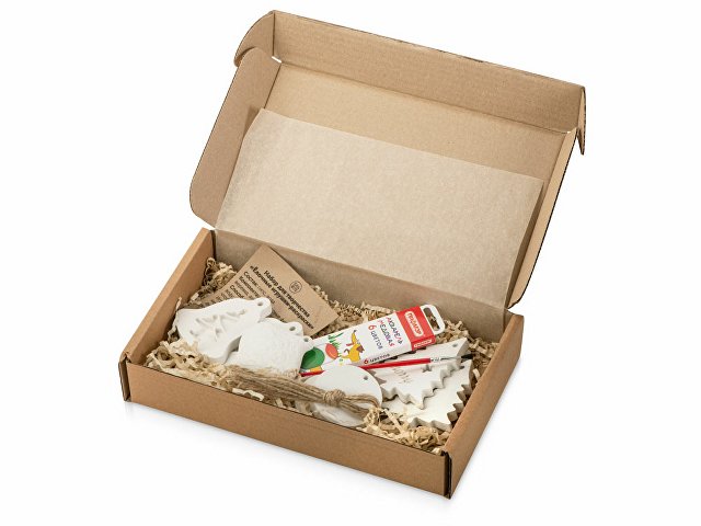 Мы подготовили готовый творческий набор, состоящий из игрушек, выполненных их гипса, кисти и акварельных красок.