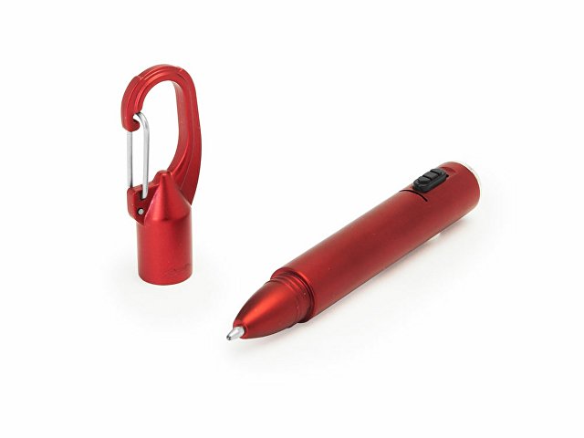 Ручка со светодиодным фонариком, доступна в различных цветах с металлическим покрытием и черной кнопкой. Встроенный карабин. Синие чернила |