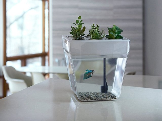 По сути — это замкнутая экосистема, поддерживающая баланс между растениями и рыбкой. Её отходы с помощью насоса поднимаются к горшочкам сверху и питают вашу маленькую плантацию. Взамен рыбка получает очищенную воду, а у любого городского жителя всегда есть в наличии свежая зелень к столу.