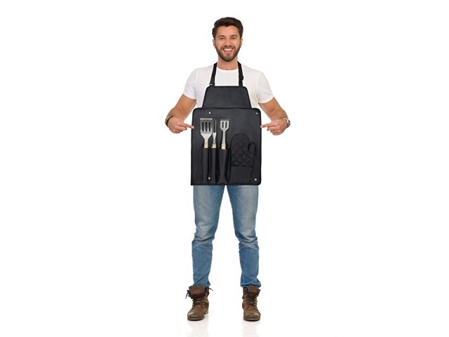 Набор для барбекю из 5 предметов: лопатка (36,5 x 7 см), вилка (36,5 x 2 см), щипцы (36,5 x 5 см), перчатка (25 x 16 см) и фартук с сумкой (42 x 60 см). Ручки сделаны из бамбука, который добывается и производится в соответствии со стандартами устойчивого развития. |