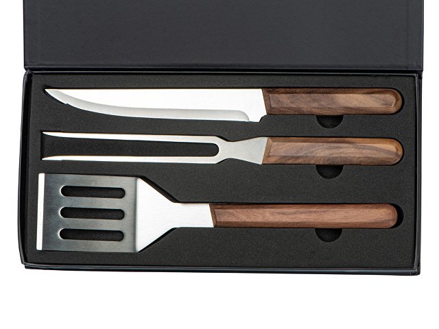 Набор для барбекю от Tour de Grass состоит из лопатки, вилки и ножа с ореховыми ручками. Все три приспособления для готовки — изящные, функциональные, прекрасно подойдут для подарка, а футляр на магните, идущий в комплекте, решит вопрос упаковки.