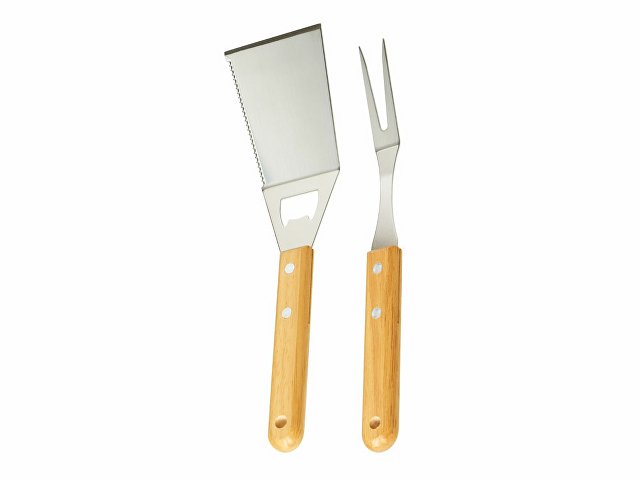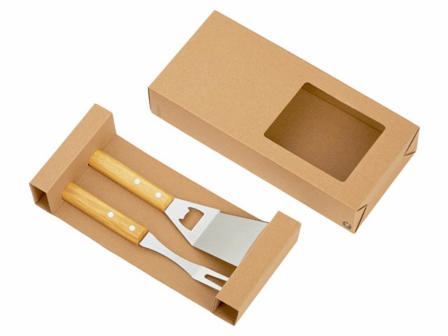 Набор аксессуаров для барбекю Grill Master с деревянными ручками состоит из двух предметов: лопатки и вилки. Лопатка также имеет дополнительную функцию - открывалки для бутылок. Набор поставляется в крафтовой коробке с окошком. |