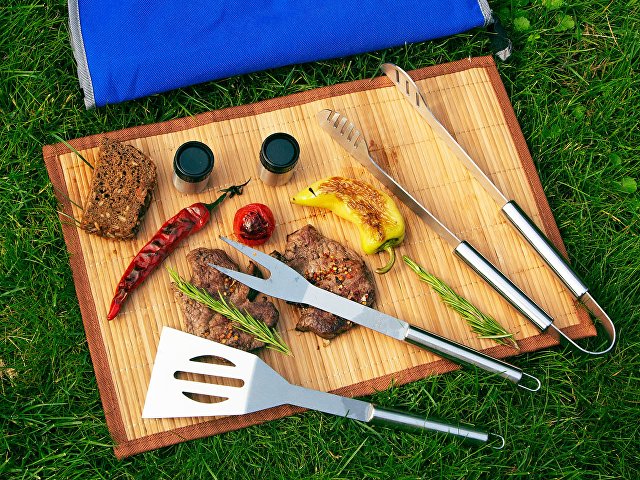 Набор включает в себя вилку, лопатку, щипцы, солонку и перечницу. Удобный чехол на замке-молнии позволяет компактно хранить составляющие набора. На чехол можно нанести изображение или надпись. |