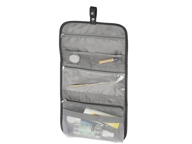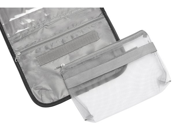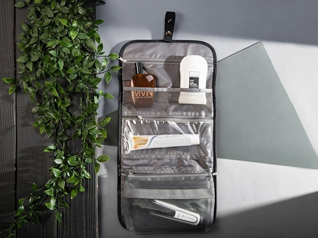 Органайзер состоит из карманов на молнии, карманов-сеток, прозрачного моющегося кармана на молнии, в который можно поместить флаконы с жидкостью — даже если емкость разгерметизируется, карман легко очистить под струей воды.