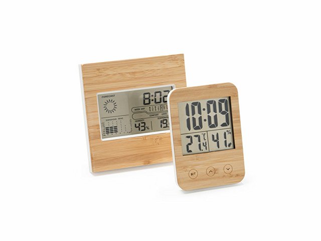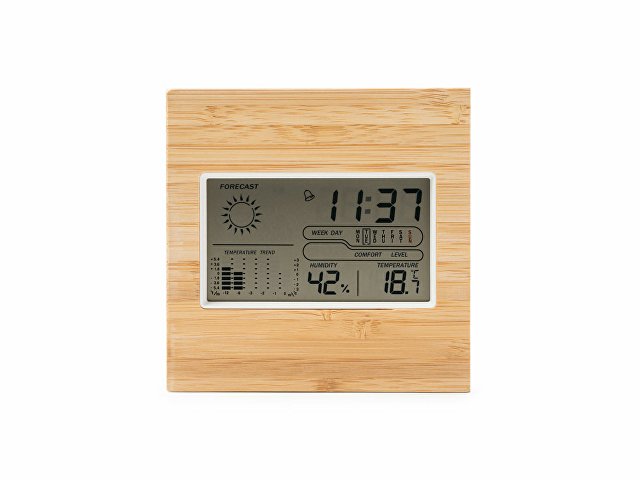 Метеостанция с лицевой стороной из бамбука. Часы, календарь и функция будильника с датчиками температуры и влажности. Запись максимальной и минимальной температуры и влажности. Работает от 2 батареек типа ААА (не входят в комплект). |