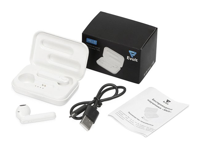 Беспроводные наушники Mels бренда Evolt обеспечивают до 16 часов суммарного воспроизведения музыки и работают на расстоянии до 10 метров от сопряженного с ним смартфона или иного гаджета. Зарядный чехол имеет разъем mini USB, внутри которого есть шкала заряда, состоящая из четырех делений.