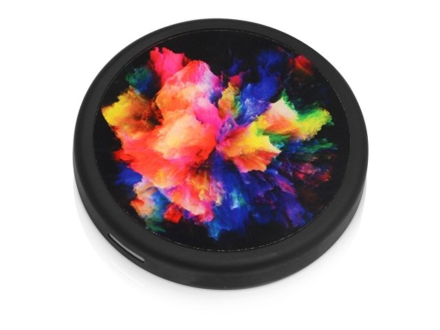 Благодаря миниатюрному размеру устройства и идеальной форме круга, вы не сразу угадаете его назначение. Этот предмет создан для тех, кто предпочитает гармонично встраивать технологии в ежедневную жизнь, деликатно скрывая их под маской обычных вещей. Главная функция устройства — беспроводная зарядка — реализуется качественно и бесперебойно. В комплекте с изделием в разобранном виде поставляется круглое закаленное стекло, на котором можно сделать красочное нанесение любого изображения. После запечатки стекло легко крепится на корпус устройства.
