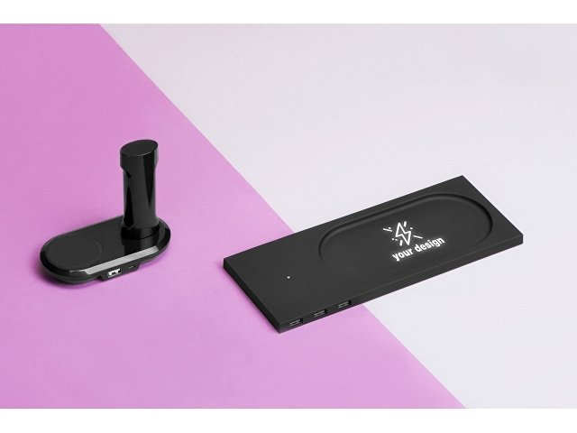 Беспроводное настольное зарядное устройство Glide выполнено из пластика с покрытием soft-touch. Кроме функции беспроводной зарядки имеет также 3 зарядных USB-разъема. Компактный органайзер имеет отсек для мелочи. После гравировки на устройстве вскрывается белый цвет подсветки, что позволяет сделать необычную и стильную персонализацию на этом гаджете. |
