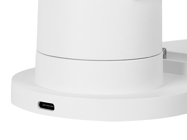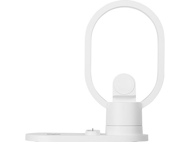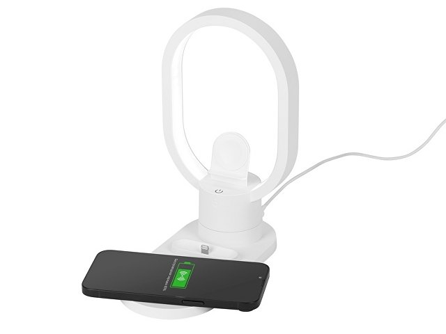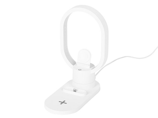 Настольная зарядная станция с лампой для трёх устройств - смартфона с поддержкой беспроводной зарядки, часов Apple и наушников Apple (разъем Lightning). Регулируемый уровень яркости (диммер). Лампу можно вращать вокруг своей оси. Для удобства транспортировки лампу можно отсоединить.