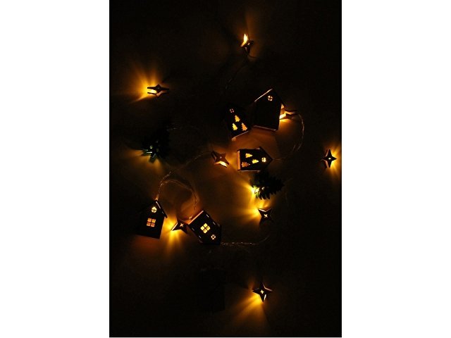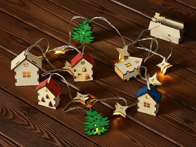 Светодиодная новогодняя елочная гирлянда постоянного свечения с цветными фигурками из натуральной березовой фанеры. Работает от 2-х батареек АА (в комплекте). |