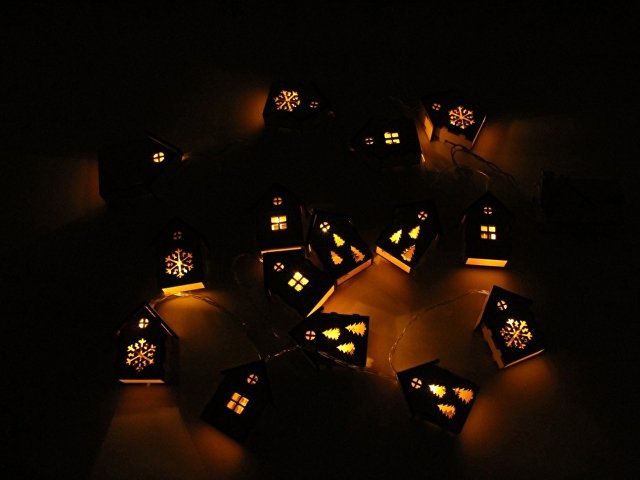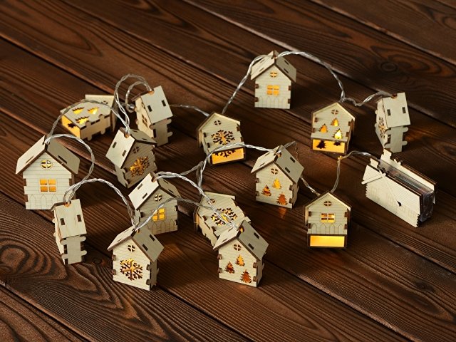 Светодиодная новогодняя елочная гирлянда постоянного свечения с домиками из натуральной березовой фанеры. Работает от 2-х батареек АА (в комплекте). |
