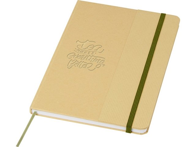 Блокнот формата А5 в твердой обложке из переработанного картона, 80 листов бумаги плотностью 70 г/м? в линейку. Блокнот имеет эластичную застежку, ленту и закругленные углы. FSC certified paper. FSC Mix 100% P7.1 CU-COC-877277. |