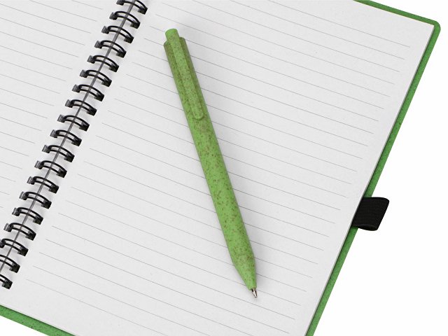 Блокнот с обложкой из переработанной пшеницы и пластика. Блок состоит из 80 листов переработанной бумаги белого цвета. Крепление - пружина. В комплекте шариковая ручка в тон блокноту из пшеничной соломы. |