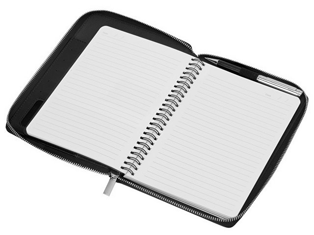 Бизнес блокнот Fabrizio состоит из пенала на молнии выполненного из искусственной кожи, и сменной тетради на 80 листов на кольцах с перфорированными линованными листами белого цвета.