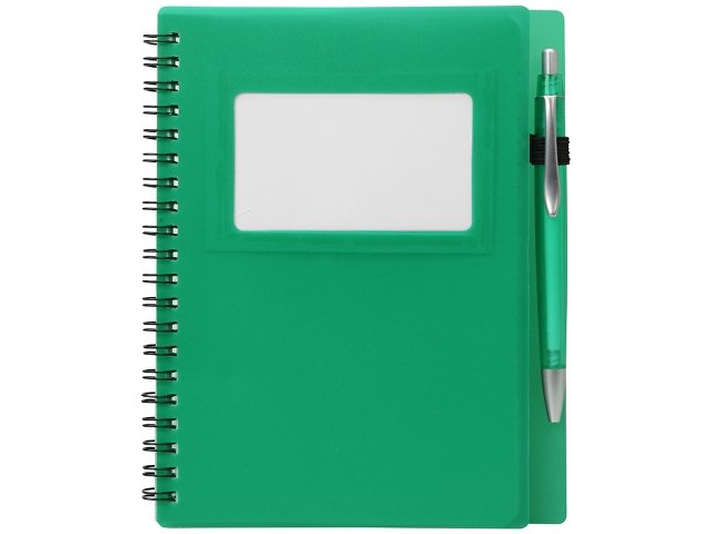 Блокнот Контакт в полипропиленовой обложке переплетен на пружине. В обложке блокнота предусмотрено окошко, в которое можно поместить визитную карточку или полиграфическую вставку. В комплекте с блокнотом идет ручка, которая вставляется в петельку сбоку.