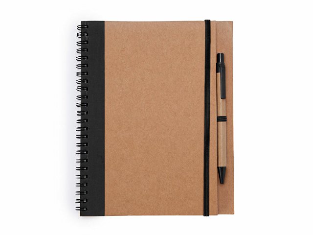 Блокнот на спирали с жесткой обложкой из переработанного картона. Включает шариковую ручку с синими чернилами. 60 простых листов. |